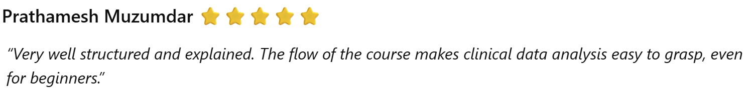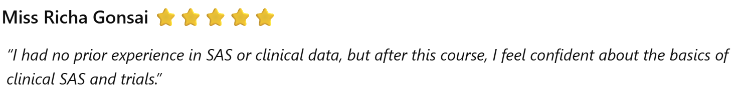 The course takes you through an example clinical study sample data, and generate various Clinical Study Reports that are submitted to the FDA (in the US) or other regulatory authorities in other countries. You will not only hone your SAS programming skills but will also learn essential concepts needed to work in the Pharma industry in the areas of Biostatistics and Clinical Data Management.