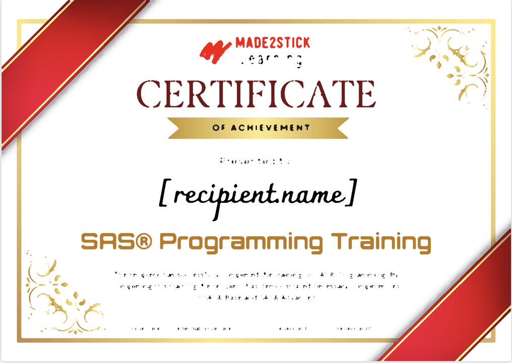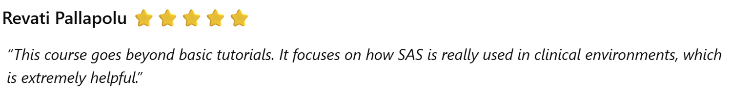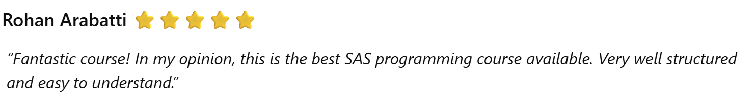 If you wish to further hone your SAS programming skills learnt in this course and apply it on a practical real-life example, I recommend you take my other course on Clinical SAS Programming (clinicalsas.made2sticklearning.com). If the clinical portion doesn’t interest you, can you skip straight to the hands-on programming lectures (Section 3 onward) where you will begin working with a sample (clinical) data in an Excel sheet, which you will import into SAS, derive all necessary variables as in the mock shell specifications through various procs and functions, and finally generate a clinical study report. All this will be done using guided SAS Programming steps with detailed explanations at every step of programming